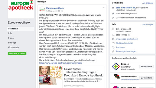 Mit einem Gewinnspiel auf Facebook zielt die Europa Apotheek auf potenzielle Neukunden: Wer den Auftritt des zur Shop-Apotheke gehörenden Versenders mit einem „Gefällt mir“ markiert und dazu noch ein „Like“ unter den Post zum Preisausschreiben setzt, erhält die Chance auf einen von zwei Erlebnisgutscheinen von Mydays im Wert von jeweils 500 Euro. Geradezu bescheiden sehen da die 5 Euro aus, die Mycare aktuell an zusätzlichem Rabatt auf die Kategorie „Allergie & Heuschnupfen“ spendiert.