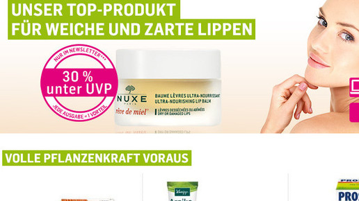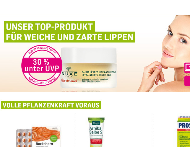 Frühlingsblütenfrisch kommt der aktuelle Newsletter von DocMorris in die virtuellen Postfächer. „Jedes Produkt reduziert – schauen Sie selbst!“ So lockt die Betreffzeile. Im Mailing selbst wird diese Behauptung nicht weiter aufgegriffen. Vielmehr lockt der Versender hier mit satten Rabatten auf ausgesuchte Naturkosmetikprodukte und pflanzliche Arzneimittel.