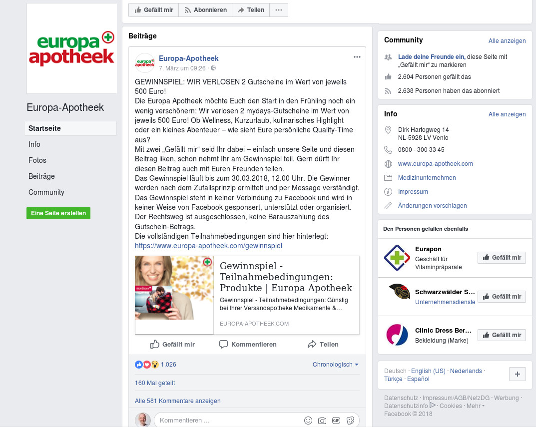 In den potenziellen Genuss kommen nur Nutzer der sozialen Medien. Auf der Website der Versandapotheke ist das Gewinnspiel nicht zu finden. Ein Wohnsitz in Deutschland ist zwingend erforderlich. Bis zum 30. März um 12 Uhr kann man sich beteiligen und gibt damit sein Einverständnis, über den Facebook-Messenger benachrichtigt zu werden. Im Gegenzug versichert die Europa Apotheek in den auf der Internetseite hinterlegten Teilnahmebedingungen, „dass alle erfragten persönlichen Daten nur zum Zwecke des Gewinnspiels und dessen Betreuung verwendet werden“. Die Begeisterung ist groß, wie die mehr als 1000 Likes seit dem 7. März zeigen. 160 Mal wurde der Post bereits geteilt.