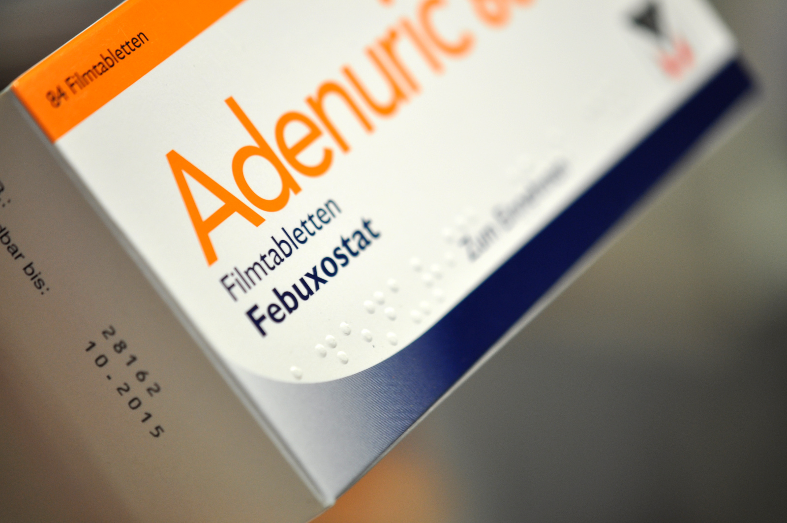 Adenuric wurde im Februar 2010 eingeführt und ist als Filmtablette mit 80 und 120 mg auf dem Markt. Eingesetzt wird das Präparat bei Erwachsenen zur Therapie der chronischen Hyperurikämie bei Erkrankungen, die bereits zu Uratablagerungen geführt haben, einschließlich eines aus der Krankengeschichte bekannten oder aktuell vorliegenden Gichtknotens und/oder einer Gichtarthritis.