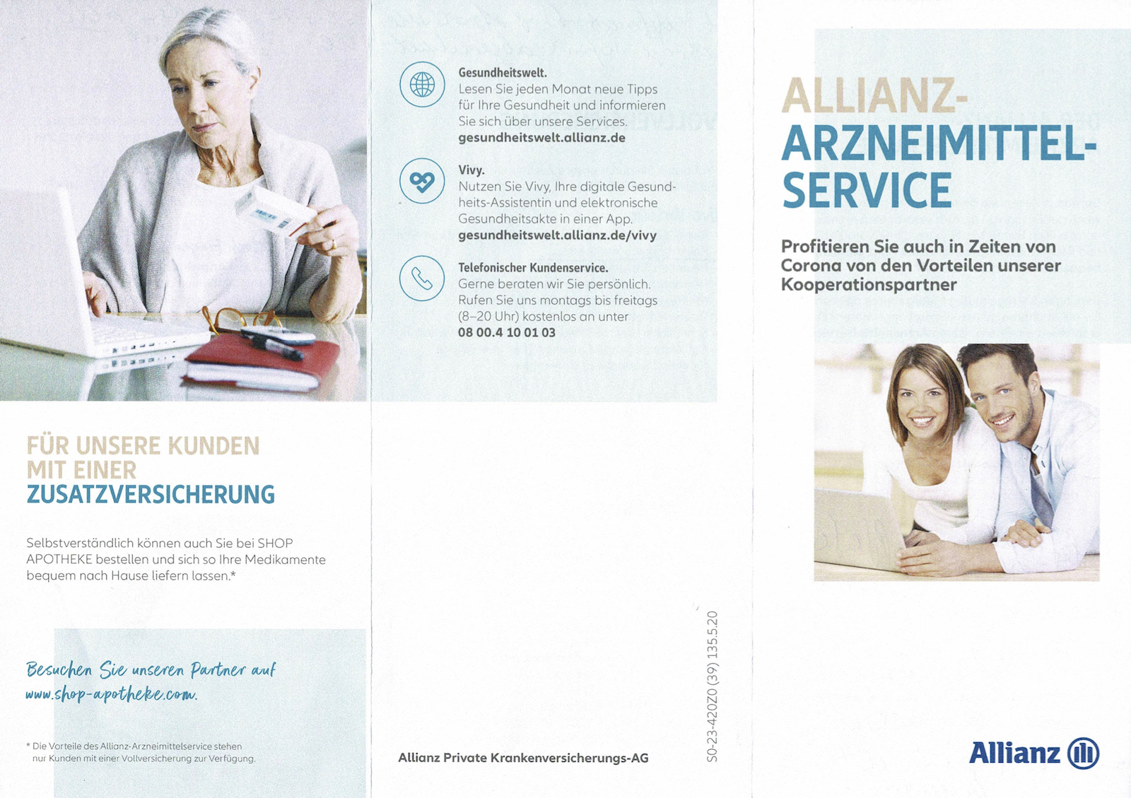 „Medikamente ohne Vorauszahlung – der Allianz Arzneimittelservice“, lautet die Überschrift der Werbebotschaft. Und in Anspielung auf die Corona-Krise heißt es weiter: „Gerade in Zeiten wie diesen wäre es doch praktisch, wenn der Bezug von ärztlich verordneten Arzneimitteln deutlich komfortabler wäre. Ohne Vorauskasse und Rechnungseinreichung? Dafür ganz einfach, bequem und dennoch flexibel.“ Wer regelmäßig Medikamente benötige oder auf hochpreisige Arzneimittel angewiesen sei, dem empfiehlt die Allianz ihren „Arzneimittelservice“.
