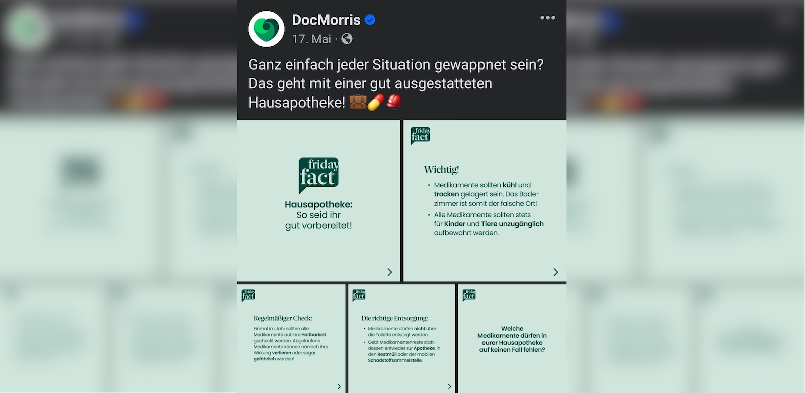 „Ganz einfach jeder Situation gewappnet sein? Das geht mit einer gut ausgestatteten Hausapotheke!“ So postet es der niederländische Versender auf Facebook. Auf fünf Slides gibt DocMorris anschließend seine Praxistipps zum Besten. Die wichtigen Buzzwords sind dabei fett markiert.