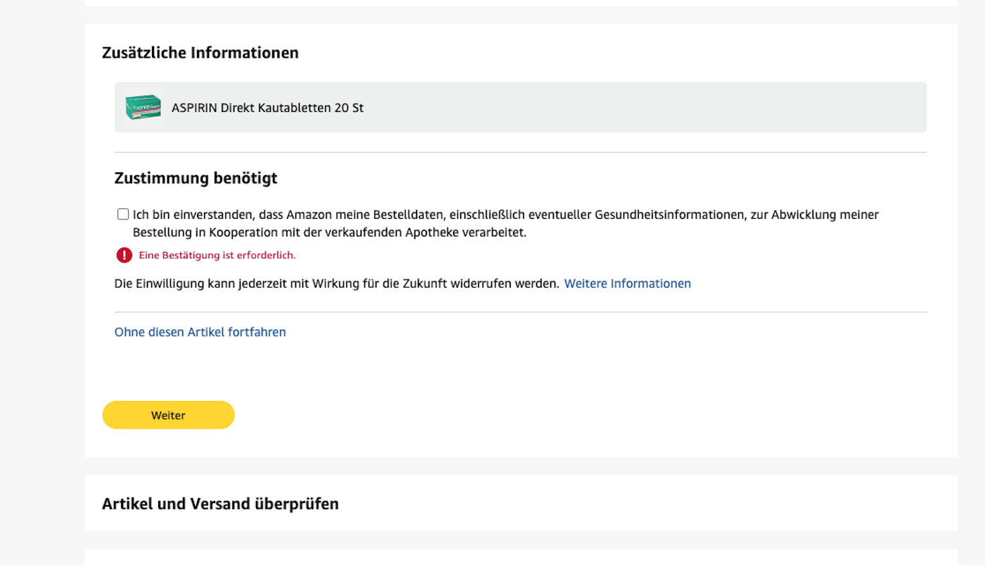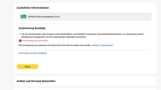 Nur wenige Wochen später präsentiert Amazon jetzt eine erste Lösung. Wer ein OTC-Produkt in den Warenkorb packt, wird auf dem Weg zur Kasse explizit nach seiner Zustimmung gefragt. „Zusätzliche Informationen“, heißt es unter den Fenstern für Versandadresse und Zahlungsmittel. Dann ist das präferierte Produkt abgebildet. „Zustimmung benötigt“, heißt es weiter.