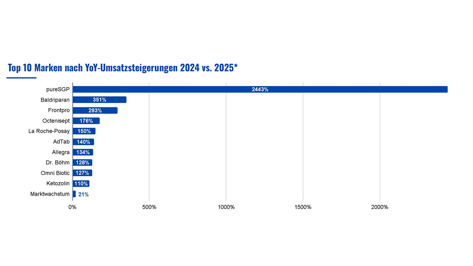 Vor allem kleinere Marken wachsen allerdings deutlich überdurchschnittlich. An der Spitze liegt PureSGP mit einem Plus von 2443 Prozent, gefolgt von Baldriparan (PharmaSGP) mit 351 Prozent, Frontpro (Boehringer) mit 293 Prozent und Ocentisept (Schülke) mit 176 Prozent. Auch La Roche-Posay (L‘Oréal) kommt mit einem breiten Angebot von 180 Artikeln auf 150 Prozent – „ein klassischer Volumentreiber“, so Balkenhol.