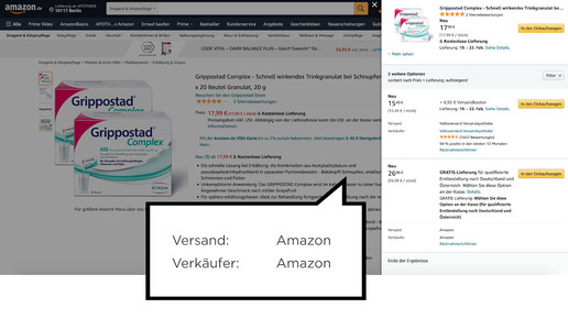 So können Kunden bei Amazon das Erkältungsmittel Grippostad Complex (ASS/Pseudoephedrin) kaufen. An oberster Stelle taucht das Angebot eines externen Händlers auf – je nach Packungsgröße ist das Apo-Discounter oder Beraterapotheke aus dem niederländischen Venlo. „Verkauf und Versand“ durch den jeweiligen Partner, steht im Kleingedruckten. „Für weitere Informationen, Impressum, AGB und Widerrufsrecht klicken Sie bitte auf den Verkäufernamen.“ Immerhin: „Kauf abgedeckt durch den Käuferschutz von Amazon“, heißt es weiter.