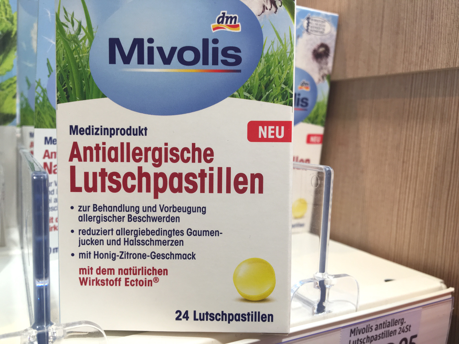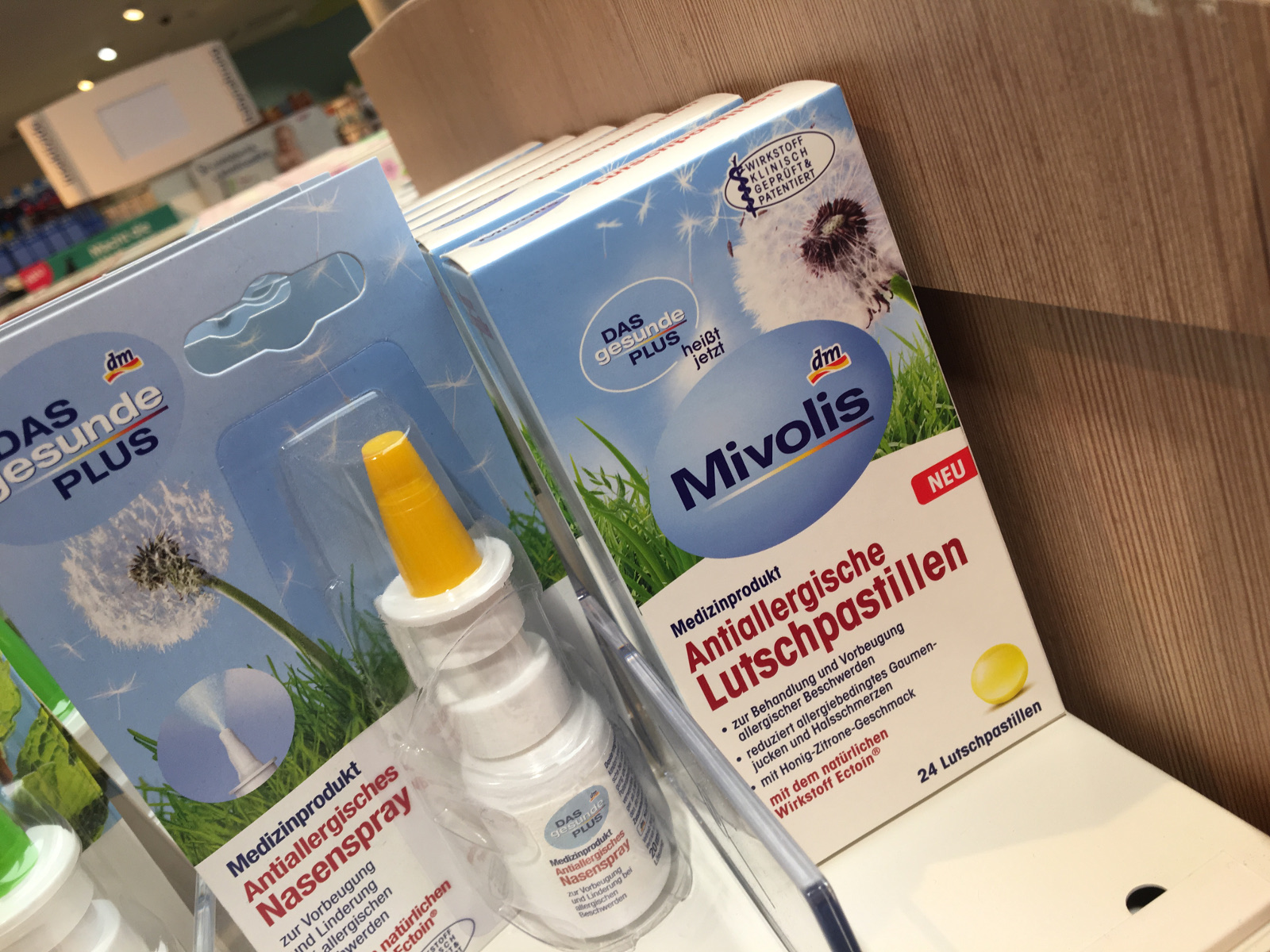 Die Eigenmarke der Drogeriekette dm war mehr als 20 Jahre unter dem Namen „Das gesunde Plus“ zu finden. Seit einiger Zeit werden die Produkte unter der Marke „Mivolis“ angeboten. Neu zum Portfolio gehören antiallergische Lutschpastillen mit Ectoin, die zur Behandlung und Vorbeugung von allergischen Beschwerden eingesetzt werden können. Das Präparat ist als Medizinprodukt eingestuft. Auf der Packung prangt der Zusatz: „Wirkstoff klinisch geprüft und patentiert“. Der natürliche Inhaltsstoff Ectoin soll allergiebedingtes Gaumenjucken und Halsschmerzen reduzieren.
