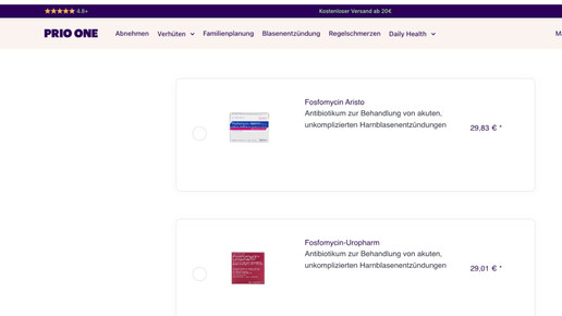 „Rezept & Antibiotika Online – Blasenentzündung online behandeln“, lautet das Motto von Prio One. Das Unternehmen verspricht, dass Erkrankte innerhalb von fünf Minuten eine Antibiotikum-Verordnung erhalten können, ganz ohne Wartezeit und Termin. Für eine Behandlungsgebühr von 18,99 Euro zuzüglich Medikament wird angeblich ein Rezept ausgestellt. Geliefert wird am nächsten Werktag, wenn die Bestellung vor 14 Uhr eingeht.