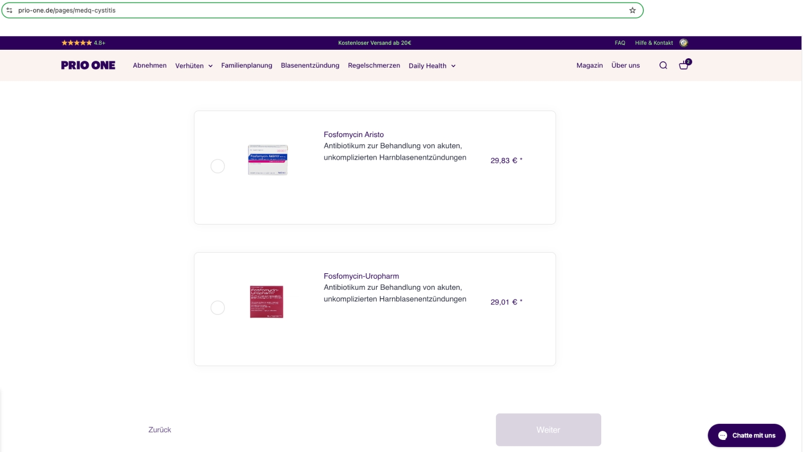 Bei Prio One wählen Patientinnen ihr Antibiotikum per Klick selbst aus – ohne echten Arztbesuch, dafür mit Aufpreis. Die Plattform verkauft das Präparat plus Behandlungsgebühr deutlich über dem Festpreis. Da der Fragebogen ohne Warte- oder Ladezeiten direkt zur Bezahlung führt, bleiben noch ganz andere Fragen offen: Wo werden Ärzt:innen im Bestellprozess überhaupt eingebunden? Und wo ist das ausgestellte Rezept?