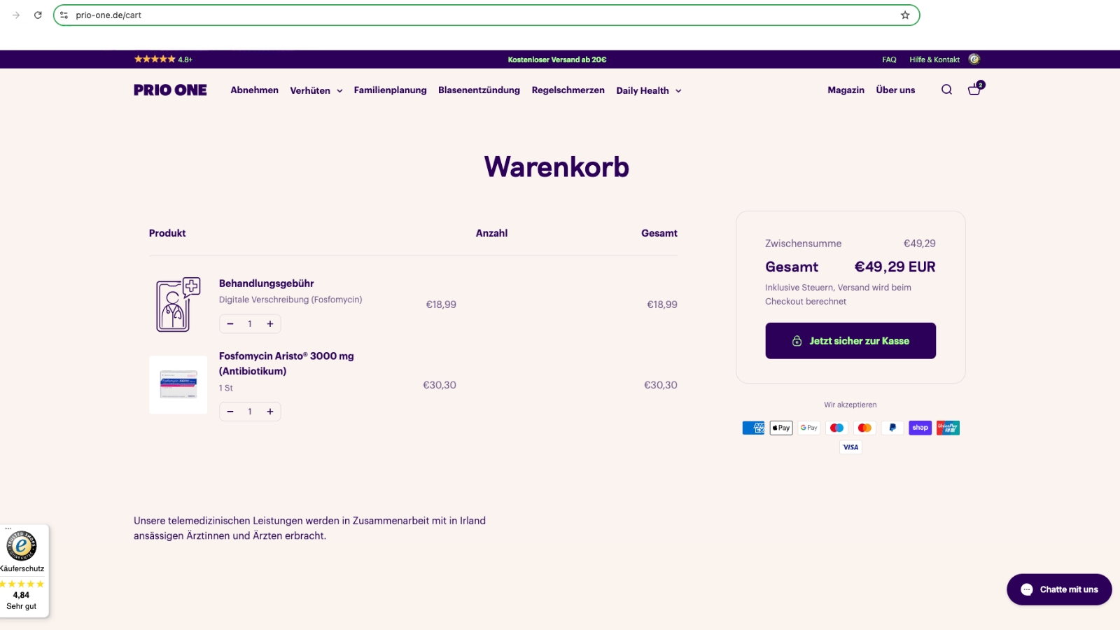 Mit einem Klick auf „weiter“ wird Mannose und Urinstix als Zusatzverkauf angeboten, und das Produkt landet nahtlos im Warenkorb. Bis dahin scheint weder ein E-Rezept erstellt noch eine ärztliche Prüfung erfolgt, da weder Einblendungen noch Ladezeiten auftreten. Prio One erklärt: „Die Angaben der Nutzenden werden medizinisch von unabhängigen sowie in der EU zugelassenen und niedergelassenen Ärztinnen und Ärzten gründlich geprüft und erfolgt vor Ausstellung des Rezepts. Wenn gesundheitliche Bedenken bestehen, wird das Rezept nicht verordnet.“