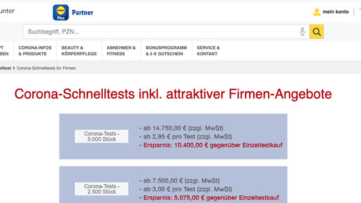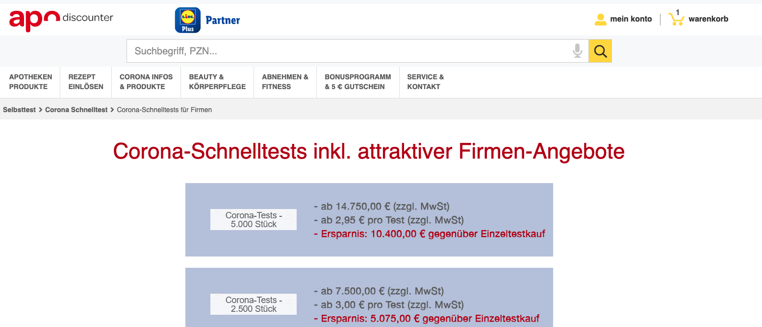 Die Testpakete für Unternehmen beginnen bei 200 Stück und einem Preis ab 908 Euro. „Wir bieten Ihnen als Arbeitgeber jetzt exklusive Test-Pakete zu attraktiven Preisen an. Je nach Mitarbeiterzahl wählen Sie das für Ihr Unternehmen beste Angebot aus und bestellen – wir kümmern uns um alles Weitere!“, heißt es auf der Internetseite. Die Bestellung werde umgehend bearbeitet. Bei Bedarf gebe es eine „umfassende Beratung von unserem kompetenten Pharmazeuten-Team“.