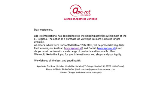 Doch jetzt wird der Service eingeschränkt: Apo-Rot informiert aktuell über die Entscheidung, die Versandaktivitäten in den meisten EU-Regionen einzustellen. Bestellungen sind seit heute nicht mehr möglich; Aufträge mit Datum vor dem 12. Juli werden noch regulär bearbeitet. Man danke Kunden für ihr Interesse und ihre Treue und wünsche ihnen das Beste und gute Gesundheit.