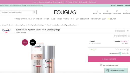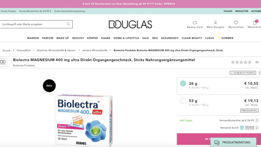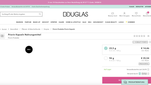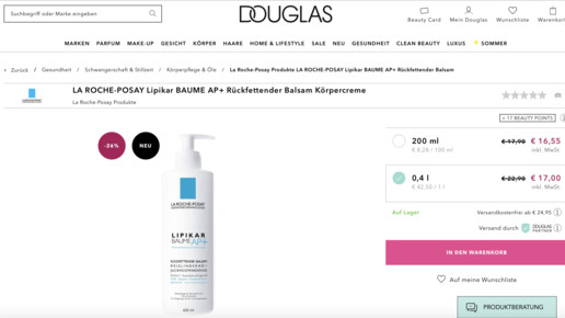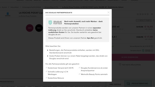 Seit Anfang der Woche sind zahlreiche Apothekenmarken neu bei Douglas zu finden. Versand durch Douglas-Partner, heißt es kleingedruckt auf den jeweiligen Produktseiten. Klickt man auf das Info-Symbol, öffnet sich ein Fenster mit der Information: „Dieses Produkt wird Ihnen von unserem Partner Apo-Rot geschickt.“