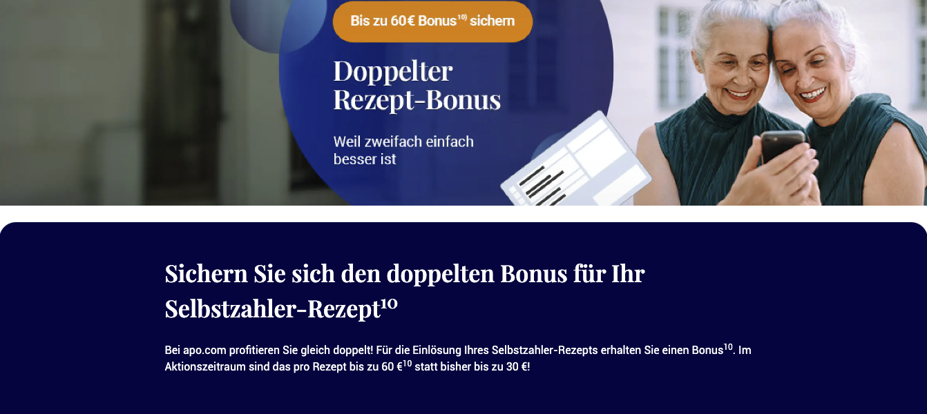 Somit ergibt sich im Regelfall ein maximaler Bonus pro Privatrezept über 30 Euro. „Im Zeitraum vom 04.01. bis 30.05.2024 erhalten Sie für das Einlösen eines Rezeptes als Selbstzahler doppelten Rezept-Bonus.“ Im besten Fall erhalten Kundinnen und Kunden also 60 Euro für ihr Privatrezept von Apo.com.