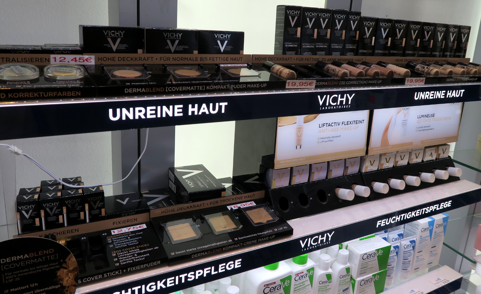 Laut Zahlen von Iqvia entfielen 2017 rund 58 Millionen Euro nach Apothekenverkaufspreisen (AVP) auf Schminke & Co. Mit hohen Werbeausgaben verdrängte Theiss die dekorative Kosmetik von Vichy auf Platz 2. Der Homburger Hersteller ist mit einem Anteil von 36 Prozent deutlich Marktführer. L’Oréal kommt mit Vichy auf 22 Prozent. Die Schwestermarke La Roche-Posay liegt mit 18 Prozent dahinter.