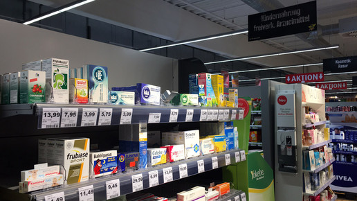 In einem Edeka-Markt in Hannover werden im Regal „Kindernahrung / freiverkäufliche Arzneimittel“ derzeit Marken aus der Offizin angeboten. Zu finden sind vor allem Erkältungsmittel: Phytohustil, Ipalat, Isla, Wick Vaporub und Vapospray sowie Pinimenthol.