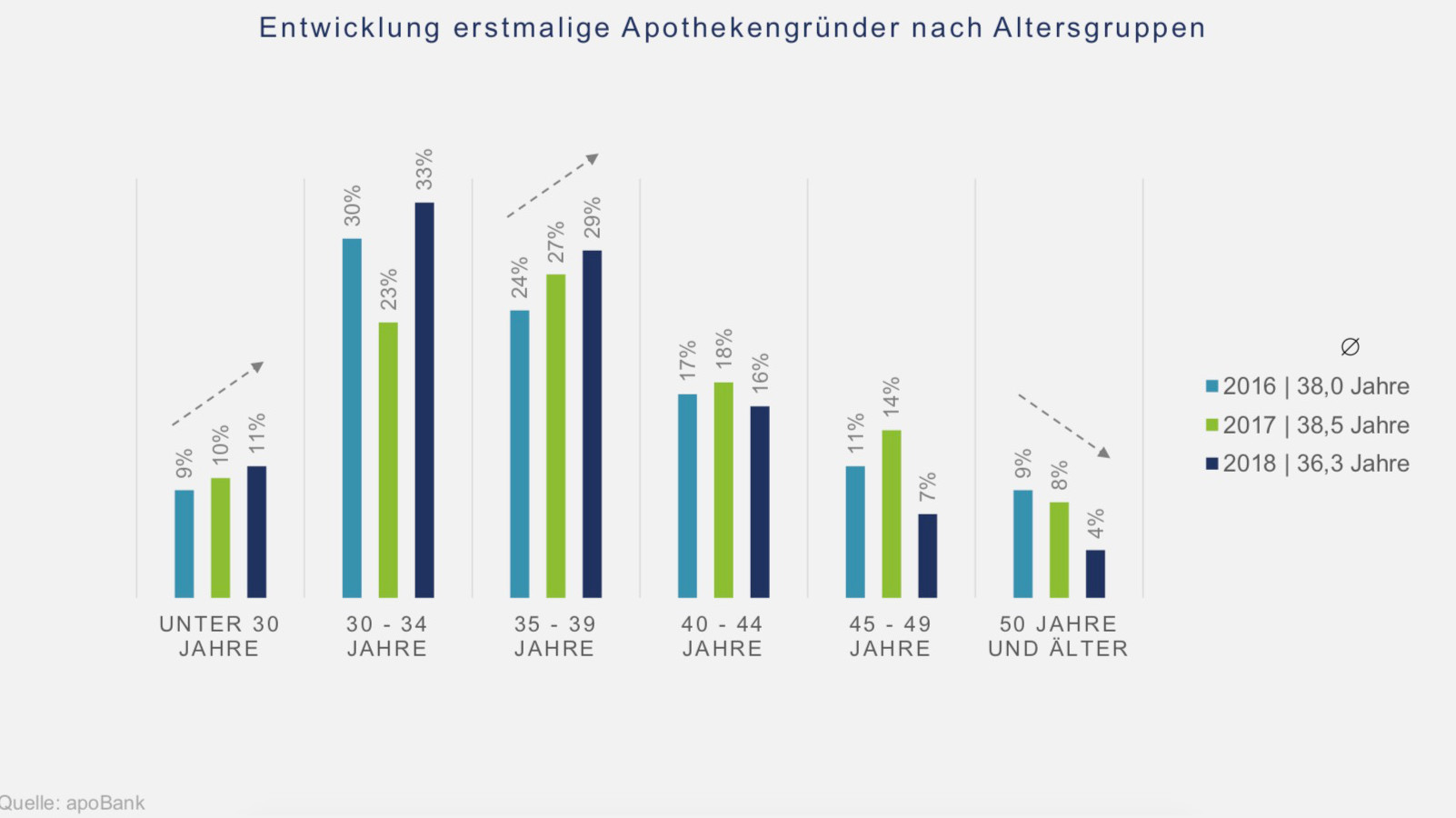 Zwar werden Gründer geschlechtsunabhängig immer jünger. Der Abstand zwischen den Geschlechtern beim Alter zur Zeit der Existenzgründung ist allerdings stabil geblieben: Frauen entscheiden sich demnach knapp drei Jahre später für die Übernahme einer Apotheke. Werden Männer im Durchschnitt mit 34,7 Jahren Inhaber, sind es Frauen mit 37,4 Jahren.