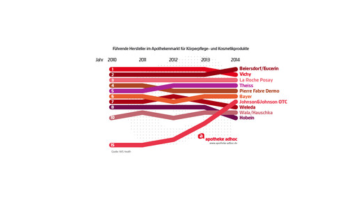 Positiv entwickelte sich dagegen mit La Roche Posay die zweite wichtige Marke von L'Oréal: Die Umsätze legten um 8 Prozent auf 99 Millionen Euro zu. Ebenfalls um knapp 8 Prozent auf 79 Millionen Euro konnte Avène von Pierre Fabre zulegen. Dr. Theiss wiederum musste bei Medipharma einen Rückgang von 8 Prozent auf 55 Millionen Euro hinnehmen.