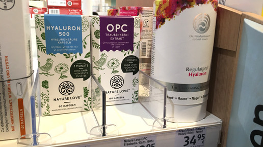 Neu bei dm ist der Hyaluron-Drink in der Großpackung erhältlich. Enthalten sind vegane Hyaluronsäure, Vitamin C, Kieselsäure, Biotin, Zink und Kupfer. Ein weiterer Inhaltsstoff ist Regulatessenz, die durch Kaskadenfermentation unter anderem aus Zitronen, Feigen, Datteln, Walnüssen, Sojabohnen, Zwiebeln, Kokosnüssen gewonnen wird.