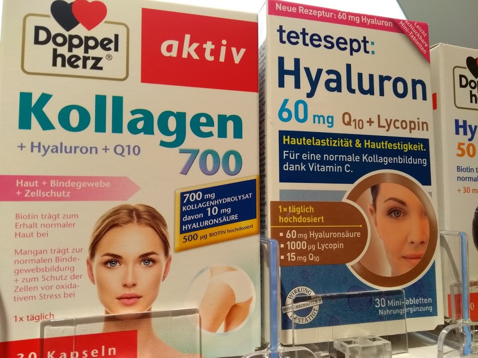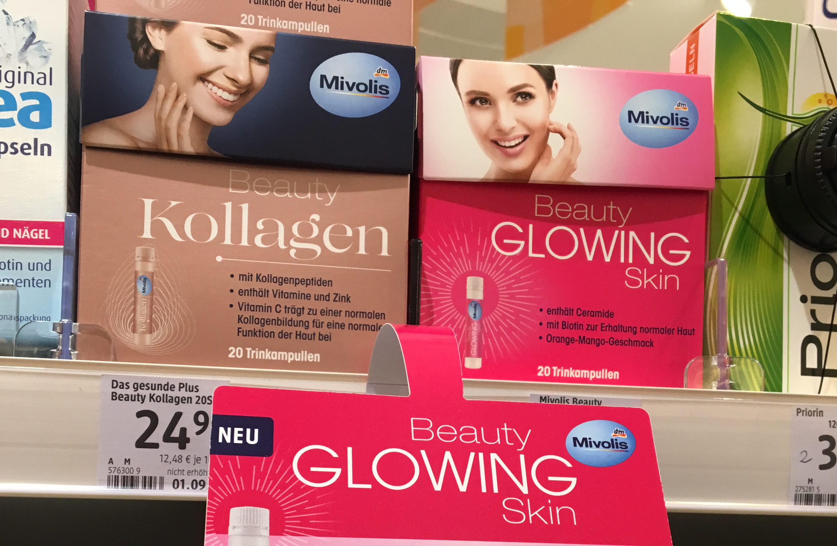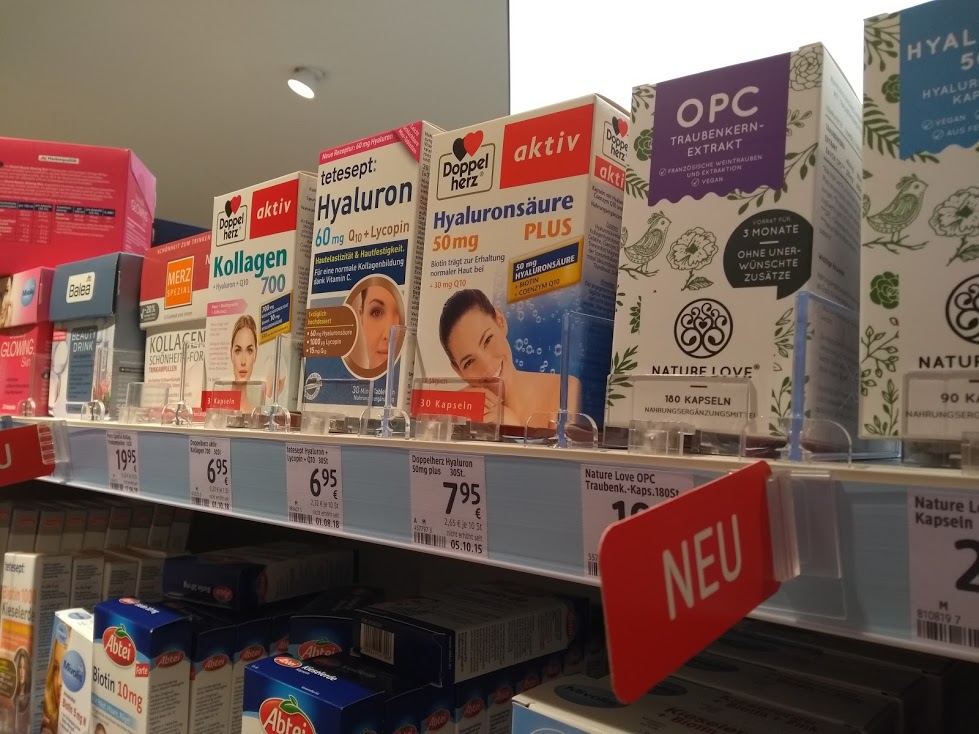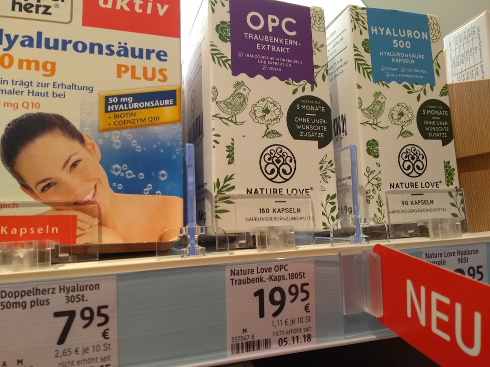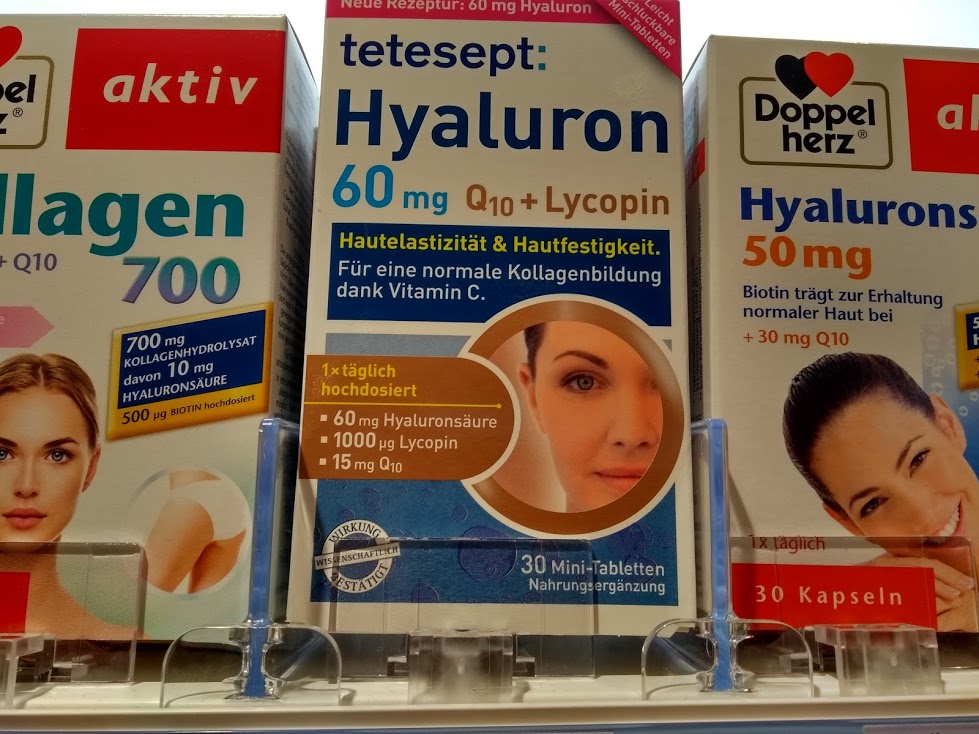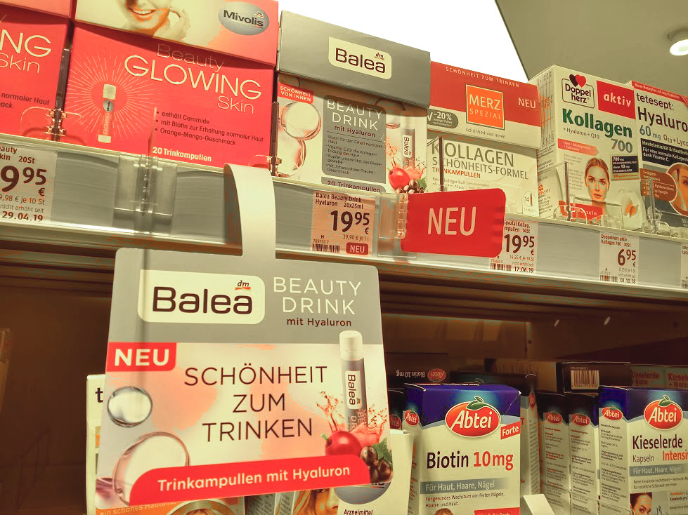 Neu bei dm ist der Hyaluron-Drink in der Großpackung erhältlich. Enthalten sind vegane Hyaluronsäure, Vitamin C, Kieselsäure, Biotin, Zink und Kupfer. Ein weiterer Inhaltsstoff ist Regulatessenz, die durch Kaskadenfermentation unter anderem aus Zitronen, Feigen, Datteln, Walnüssen, Sojabohnen, Zwiebeln, Kokosnüssen gewonnen wird.