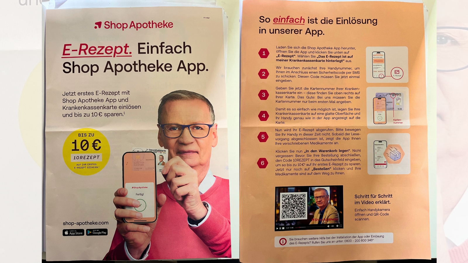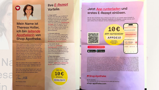 Neben ihrem kurzen Statement sind auf dem Flyer die Vorteile des E-Rezepts aufgelistet und hervorgehoben: „Wege sparen“, „schnelle Lieferung“, „bares Geld sparen“, heißt es hier. Darüber hinaus stehe ein Team von „erfahrenen Apotheker:innen und pharmazeutischen Mitarbeitenden“ parat, das obendrein einen kostenlosen Wechselwirkungscheck der Bestellung durchführe, heißt es. Auf Seite vier wird das Herunterladen der Shop-Apotheke-App, der 10-Euro-App-Gutschein und ein Block Kleingedrucktes beschrieben.