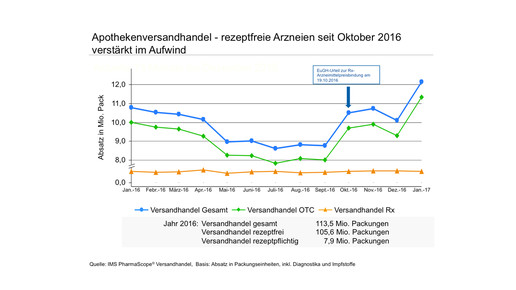 Im September wurden laut QuintilesIMS 621.000 Rx-Packungen über den Versandhandel abgegeben. Im Oktober stieg diese Zahl auf 666.000 Stück, im November auf 684.000 und im Dezember auf 685.000 Rx-Packungen. Damit war der Mini-Anstieg aber auch schon wieder vorbei: Im Januar sank der Rx-Absatz über den Versandhandel wieder auf 668.000 Packungen. Laut QuintilesIMS spiegeln diese Zahlen auch den Rx-Versand aus den Niederlanden nach Deutschland wider.