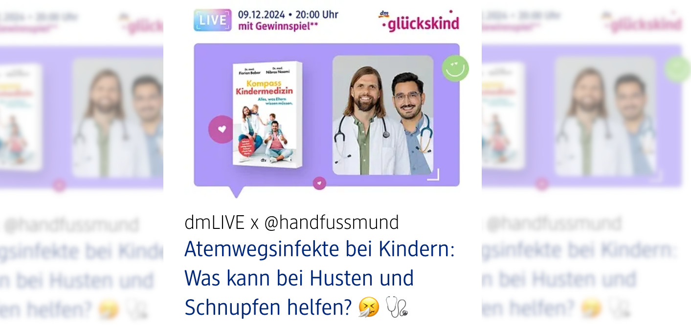 dm bietet über die eigene App ab 20 Uhr eine Online-Beratung zum Thema Atemwegsinfekte an. Die Drogeriekette inszeniert sich dabei wieder einmal als Experte bei Gesundheitsfragen und lädt zur Veranstaltung zwei Oberärzte ein. Dr. Florian Babor vom Universitätsklinikum Düsseldorf und Dr. Nibras Naami vom Gemeinschaftskrankenhaus Herdecke informieren über Husten, Schnupfen und Halsschmerzen bei Kindern. Die beiden Pädiater haben sich unter anderem für den Podcast „Hand, Fuß, Mund“ zusammengeschlossen.