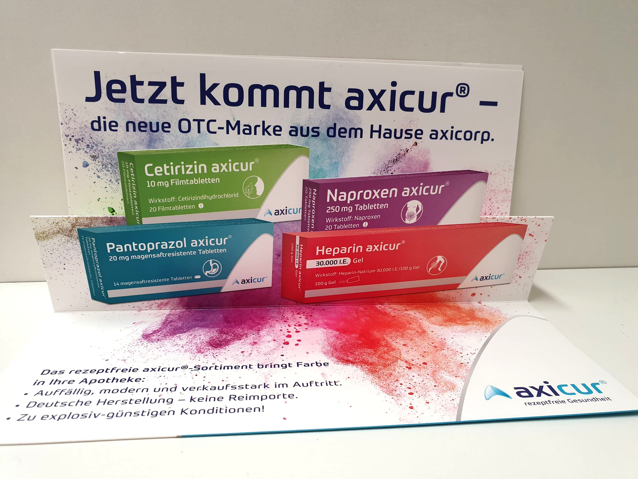 Im November kam mit Pantoprazol Axicur das erste OTC-Arzneimittel unter der Marke in die Apotheken. Im Laufe der kommenden Monate wird das bestehende Sortiment aus apothekenpflichtigen Präparaten, die im Rahmen der Selbstmedikation angewendet werden können, sukzessive umgestellt. Den Anfang machten die Anthistaminika Cetirizin und Loratadin sowie Heparin zur Behandlung von stumpfen Verletzungen. Naproxen-axi und Lop-Dia werden in Kürze folgen und als Naproxen Axicur beziehungsweise Loperamid Axicur erhältlich sein.