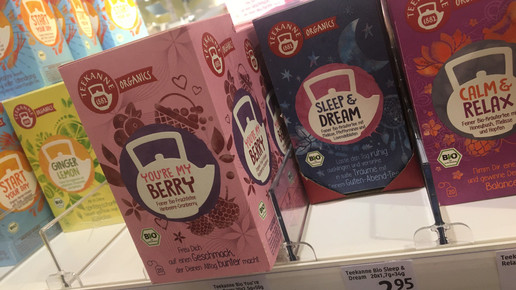 Teekanne hat derweil mit neuen Sorten die oberste Regalschiene bei dm erobert. You're my berry, Sleep & Dream und Calm & Relax und andere Varianten kommen ebenfalls in Bio-Qualität – und erinnern in der Aufmachung an die Tees, die vor zwei Jahren unter der Marke Sidrosan kurzzeitig bei dm zu finden waren.