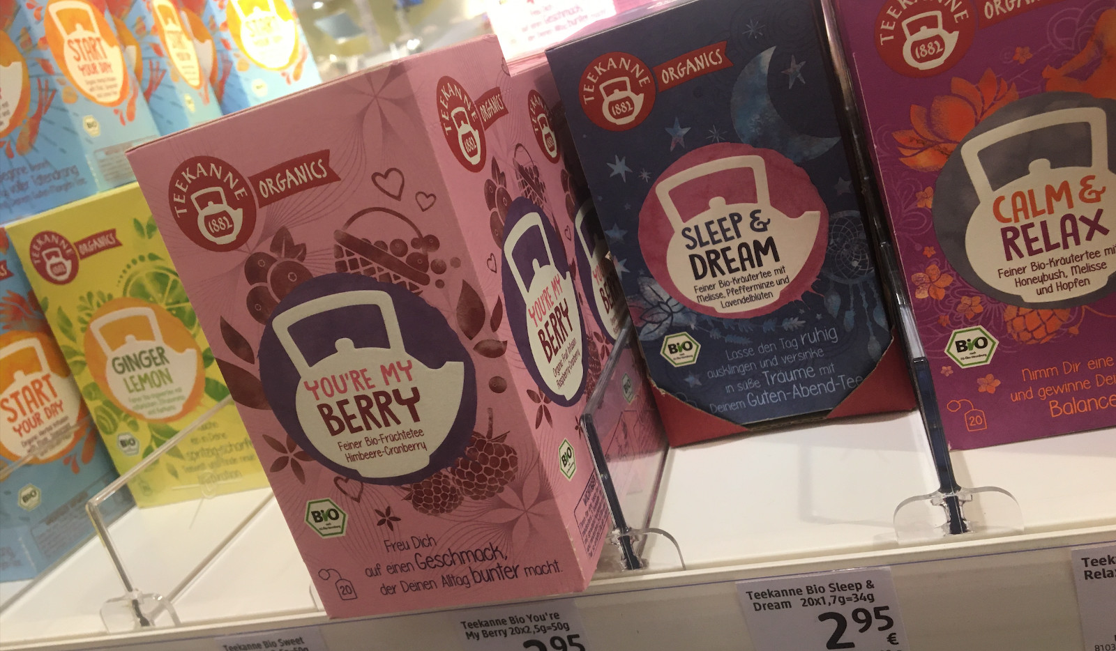Teekanne hat derweil mit neuen Sorten die oberste Regalschiene bei dm erobert. You're my berry, Sleep & Dream und Calm & Relax und andere Varianten kommen ebenfalls in Bio-Qualität – und erinnern in der Aufmachung an die Tees, die vor zwei Jahren unter der Marke Sidrosan kurzzeitig bei dm zu finden waren.