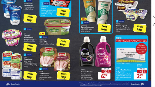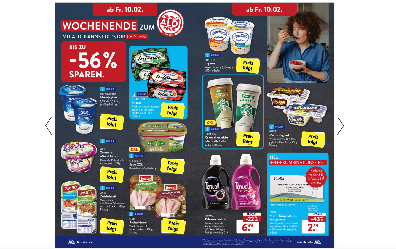 Im aktuellen Prospekt wird der 4-1-Kombinationstest noch angepriesen. Neu im Sortiment ist demnach der Test „CorDx“ des Herstellers Axnar. Die unverbindliche Preisempfehlung von 4,95 Euro will Aldi Süd demnach um 43 Prozent unterbieten und den Kombinationstest für 2,79 Euro in die Regale legen. Im Flyer heißt es explizit, dass es sich um ein Medizinprodukt zum „Nachweis von Infuenza A/B + Covis-19 + RSV mittels Nasenabstrich“ handelt, wobei es den Zusatz gibt: „Bietet keine 100%-ige Sicherheit.“
