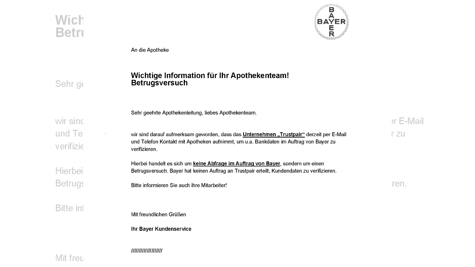 Bayer habe keinen Auftrag an Trustpair erteilt, um Kundendaten zu verifizieren: „Hierbei handelt es sich um keine Abfrage im Auftrag von Bayer, sondern um einen Betrugsversuch.“ Apothekenleiterinnen und -leiter sollen auch ihre Mitarbeitenden informieren, empfiehlt der Pharmakonzern.