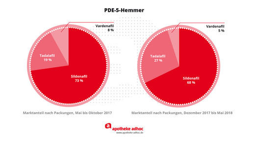 Tadalafil und Sildenafil hemmen selektiv und reversibel PDE-5 und verhindern so den Abbau von zyklischem Guanosinmonophosphat (cGMP). Bei sexueller Stimulation wird lokal Stickstoffoxid ausgeschüttet. Durch die PDE-5-Hemmung steigt der Spiegel an cGMP im Corpus Cavernosum. Die glatte Muskulatur entspannt sich. Durch den Bluteinstrom kommt es schließlich zur Erektion.