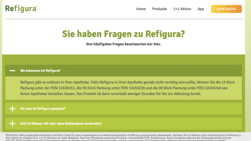 Refigura war im Frühjahr 2016 eingeführt worden; dank Mediapartnerschaft mit ProsiebenSat.1 konnte der Hersteller das Produkt in der Anfangsphase massiv im Fernsehen bewerben. Laut Iqvia war es die erfolgreichste Produkteinführung im Segment der Schlankheitsmittel in den vergangenen zehn Jahren, die sogar die Abnehmsaison 2017 in der Apotheke retten konnte.