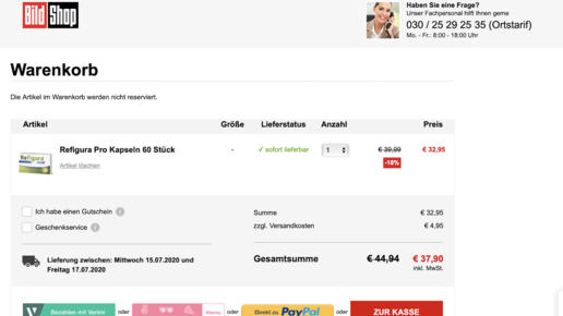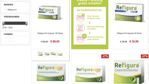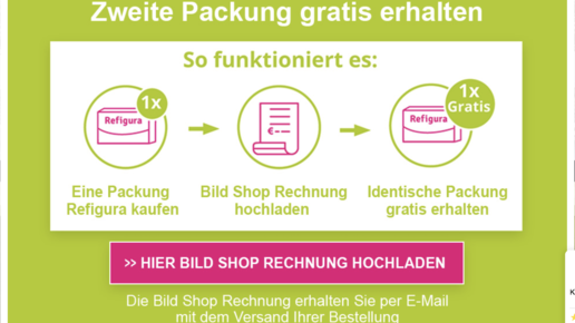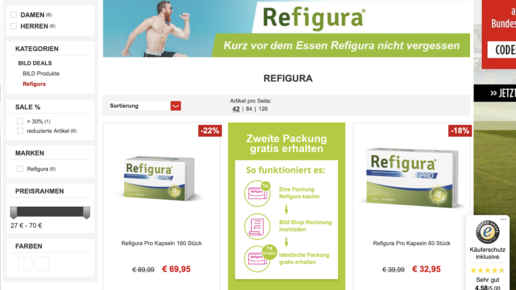 Das Abnehmmittel Refigura wird aktuell im Bild-Shop verkauft – mit Rabatten zwischen 18 und 30 Prozent. „Nur für kurze Zeit“ kann man beim Springer-Portal sogar an der 2-für-1-Aktion des Herstellers Heilpflanzenwohl teilnehmen: Einfach Kassenbon hochladen, schon gibt es die Gratispackung direkt von Bild hinterher.