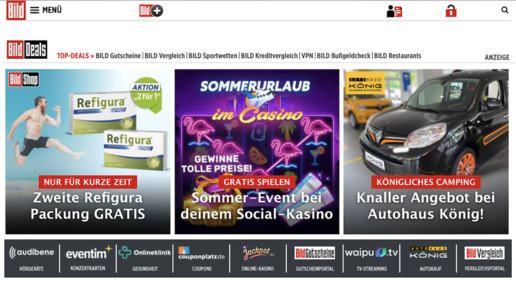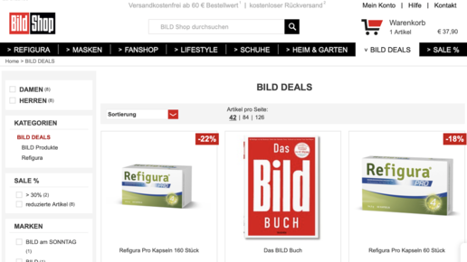 Auf der Startseite werden die aktuellen „Bild-Deals“ beworben: Neben dem „Sommer-Event bei deinem Social-Kasino“ und dem „Knaller-Angebot bei Autohaus König“ wird die „Zweite Refigura-Packung gratis“ angeboten. Das Apothekenprodukt ist dann im Shop allerdings neben diversen Bild-Büchern der einzige „Deal“.