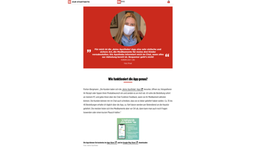 „Ich empfehle all meinen Kunden die kostenlose ‚Deine Apotheke‘-App vor allem wegen Covid-19. Viele nutzen sie auch bereits, Jüngere wie Ältere. Durch die Chat-Funktion, den Botendienst oder die Vorbestellung rezeptpflichtiger Medikamente und frei verkäuflicher Produkte kann Social Distancing viel besser eingehalten werden“, erklärt sie in der Bild-Zeitung im typischen Werbetonfall: „Die Kunden laden sich die ‚Deine Apotheke‘-App herunter und öffnen sie, fotografieren ihr Rezept oder tippen ihren Produktwunsch ein und senden es an mich ab. Ich sehe die Bestellung sofort an meinem PC und gebe ihnen über die Chat-Funktion Feedback, wann sie ihr Medikament abholen können. Die Kunden können mir im Chat auch schreiben, dass sie es lieber geliefert haben wollen. Circa 35 bis 40 Bestellungen erhalte ich täglich über die App, circa fünf davon werden per Botendienst an die Haustür geliefert. Die meisten holen sich ihre Medikamente aber vor Ort ab, dann kann man auch noch Fragen loswerden oder einen kurzen Plausch halten.“