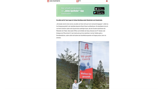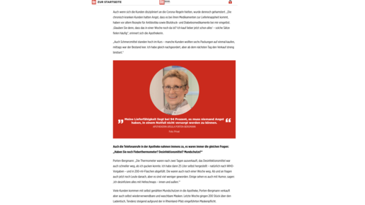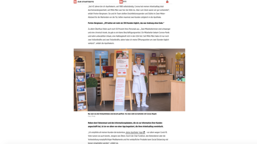 Wenig später meldete sich bei ihr eine Bild-Redakteurin per Telefon. Anschließend konnte sie den fertigen Text korrekturlesen und ihr Okay dazu geben. Und ein Fotograf kam auch vorbei. Entstanden ist daraus ein freundlicher Text über ihre Arbeit: „Ursula Porten-Bergmann steht vor ihrer Kreuzberg-Apotheke in Cochem (Rheinland-Pfalz) und hält ihre Hände routiniert unter den Desinfektionsspender am Eingang. Auf dem großen Parkplatz vor der Tür steht eine Litfaßsäule, plakatiert mit Corona-Informationen. Sie hat sogar einen eigenen Fahnenmast errichten lassen – die Fahne mit dem Aufdruck ‚Wir gegen Corona. Bleiben Sie gesund‘ flattert demonstrativ im Wind“, heißt es in der als „Brand Story“ verpackten Werbung für „Deine Apotheke“.