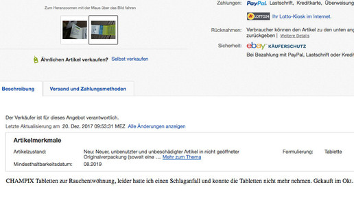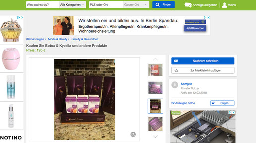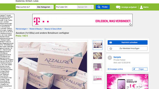 Bei Ebay Kleinanzeigen wird offenbar der Vertrieb von Präparaten für ästhetische Behandlungen aufgebaut. Der Händler Samjela ist erst seit Wochenbeginn auf dem Portal aktiv und bietet zahlreiche Produkte an. Unter den 22 Anzeigen befinden sich auch die verschreibungspflichtigen Arzneimittel Boucouture (Merz) und Azzalure (Galderma).