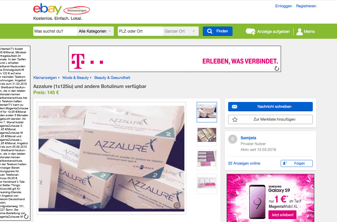 Bei Ebay Kleinanzeigen wird offenbar der Vertrieb von Präparaten für ästhetische Behandlungen aufgebaut. Der Händler Samjela ist erst seit Wochenbeginn auf dem Portal aktiv und bietet zahlreiche Produkte an. Unter den 22 Anzeigen befinden sich auch die verschreibungspflichtigen Arzneimittel Boucouture (Merz) und Azzalure (Galderma).