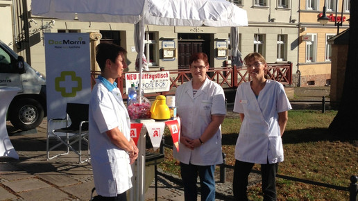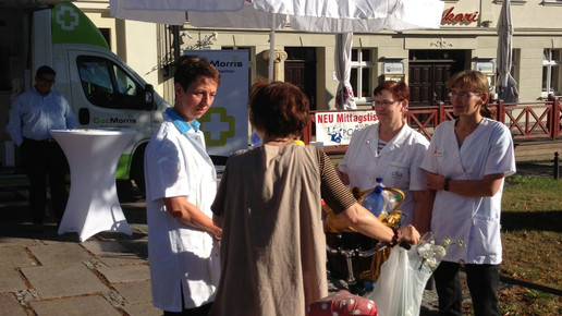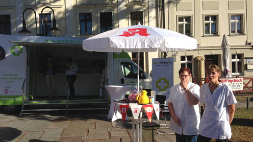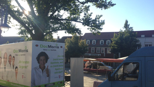 Zum Auftakt seiner Infotour macht der DocMorris-Apothekenbus in Bad Freienwalde Station. Bereits am Morgen wurde auf dem Marktplatz Stellung bezogen – vis-à-vis einer Apotheke. Die Pharmazeuten im Ort verstehen nicht, warum der Bus ausgerechnet zu ihnen kommt. An einem eigenen Stand informieren die Apotheker heute darüber, warum es keinen Bedarf für Apothekenbusse gibt.