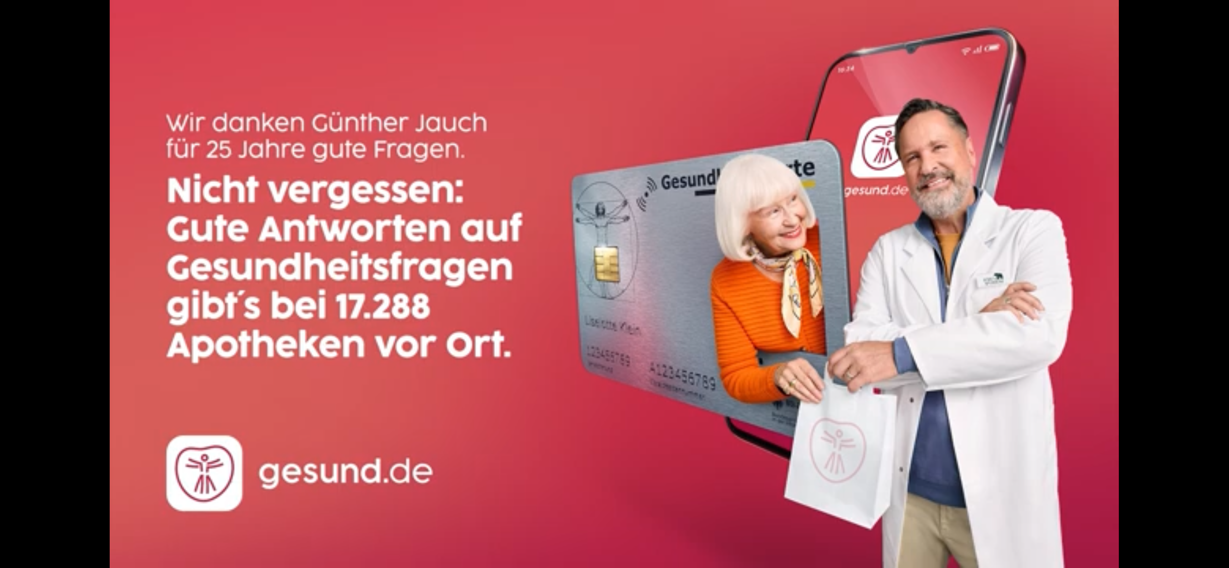 Jauch ist seit 2022 Testimonial für die Shop Apotheke und wirbt derzeit für das Einlösen des E-Rezeptes via CardLink. „Jetzt App aktualisieren. Und endlich E-Rezept mit Krankenkassenkarte einlösen.“ An die Werbung knüpft Gesund.de an und sagt dem Moderator Danke für die vielen Fragen und macht klar, wer die Antworten auf Gesundheitsfragen hat.