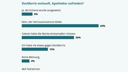 Bei einer Umfrage von APOTHEKE ADHOC gaben 44 Prozent der Teilnehmer an, dass trotz des Verkaufs der Vertrauensverlust bleibe. 30 Prozent finden, dass Celesio die Marke hätte einstampfen müssen. 15 Prozent erklärten, nie etwas gegen DocMorris gehabt zu haben. Lediglich 6 Prozent sind mit dem Verkauf zufrieden: Für sie wurde die Scharte ausgewetzt.An der Umfrage nahmen am 14. und 15. November 463 Leserinnen und Leser von APOTHEKE ADHOC teil.