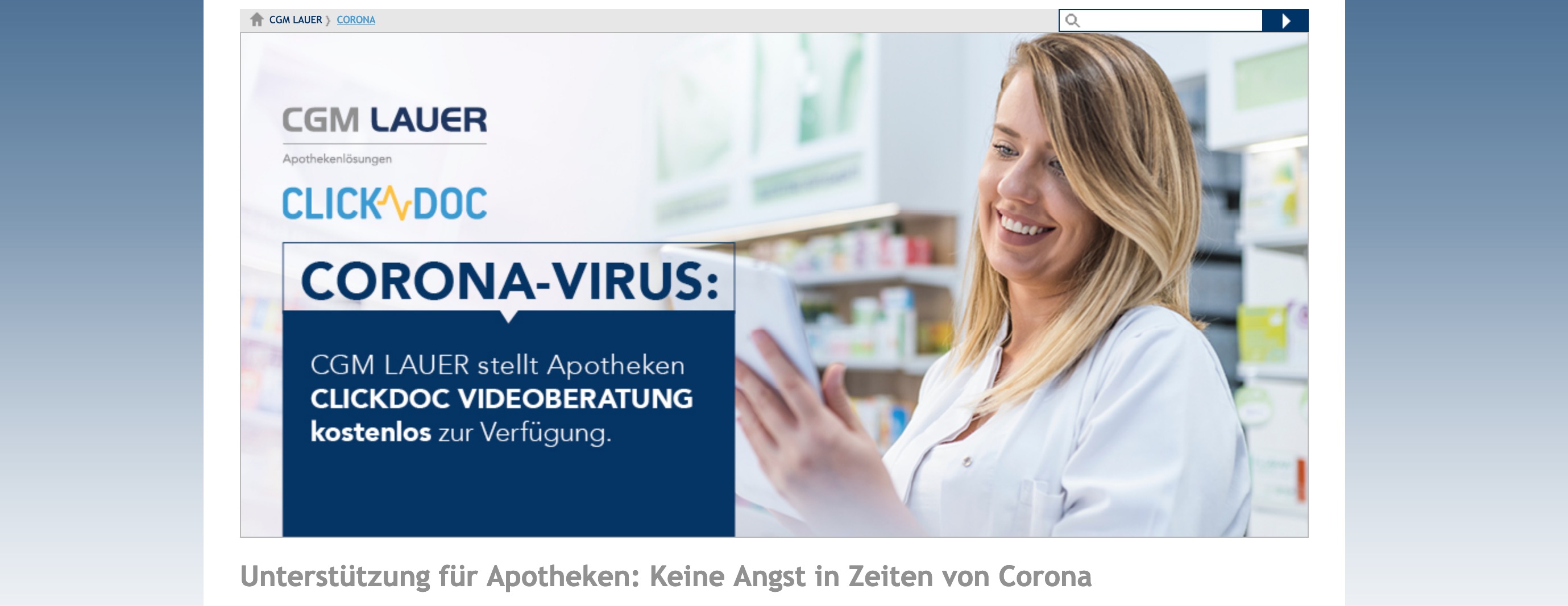 Viele Menschen wollen nicht nur der potenziellen Ansteckungsgefahr in Arztpraxen aus dem Weg gehen, sondern auch der in Apotheken. CGM Lauer hat sein Videoberatungsangebot Clickdoc deshalb nun auch auf Apotheken ausgeweitet. „Mit dem Einsatz einer Videokommunikation kann der Apotheker nicht nur seinen Kunden die notwendigen Beratungsleistungen zukommen lassen. Gleichzeitig schützt er auch seine Mitarbeiter, sich selbst und seine eigene Familie vor der Gefahr einer Ansteckung“, so CGM.