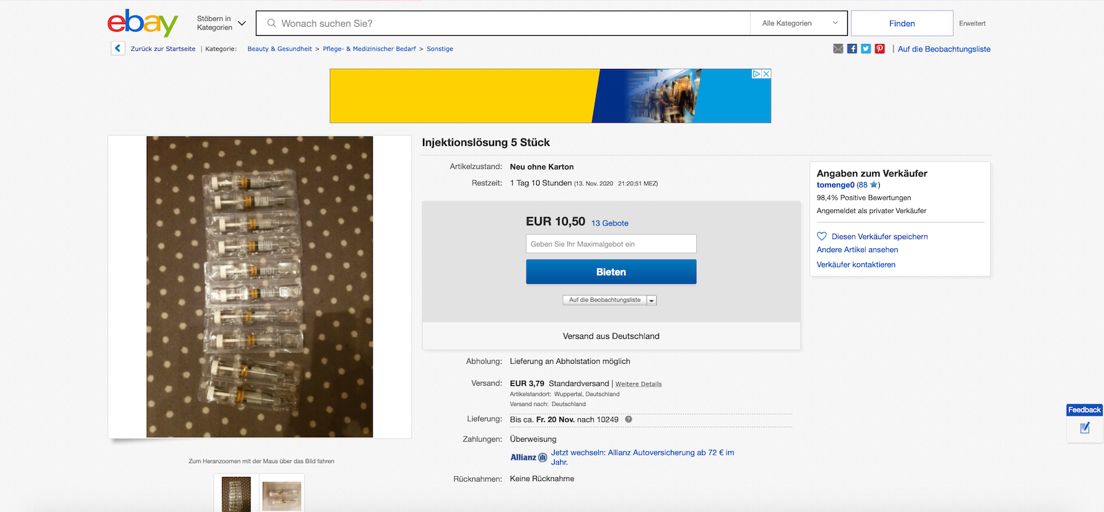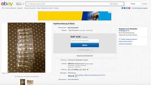 Zu wenig? „Klimaprofessor“ verkauft auch ein mit Gummi zusammengebundenes Bündel à acht Spritzen. 12 Gebote gibt es schon, 21,50 Euro sind erreicht. Das gleiche Angebot ist noch einmal verfügbar, hier liegt der Preis nach drei Geboten bei 15 Euro. Um welche Dosierung es sich handelt, wird nicht verraten. Acht sterile Alkoholtupfer gibt es jedenfalls obendrauf. Worauf sich „Zustand: ‚Neu‘“ bezieht, geht aus der kurzen Beschreibung nicht hervor.
