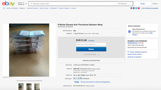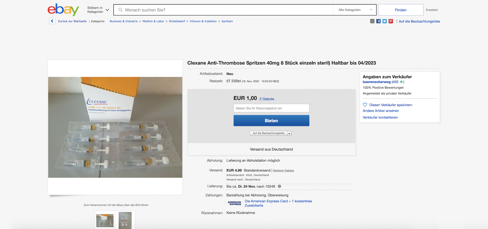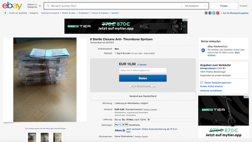 Mehr Mühe macht sich „Baerenackerweg“. Seine Anzeige „Clexane Anti-Thrombose Spritzen 40mg 8 Stück einzeln steril) Haltbar bis 04/23“ lässt keine Fragen offen. Einsteigen lohnt sich: Nach zwei Geboten liegt der Preis bei 1 Euro. Noch 5 Tage, 23 Stunden...