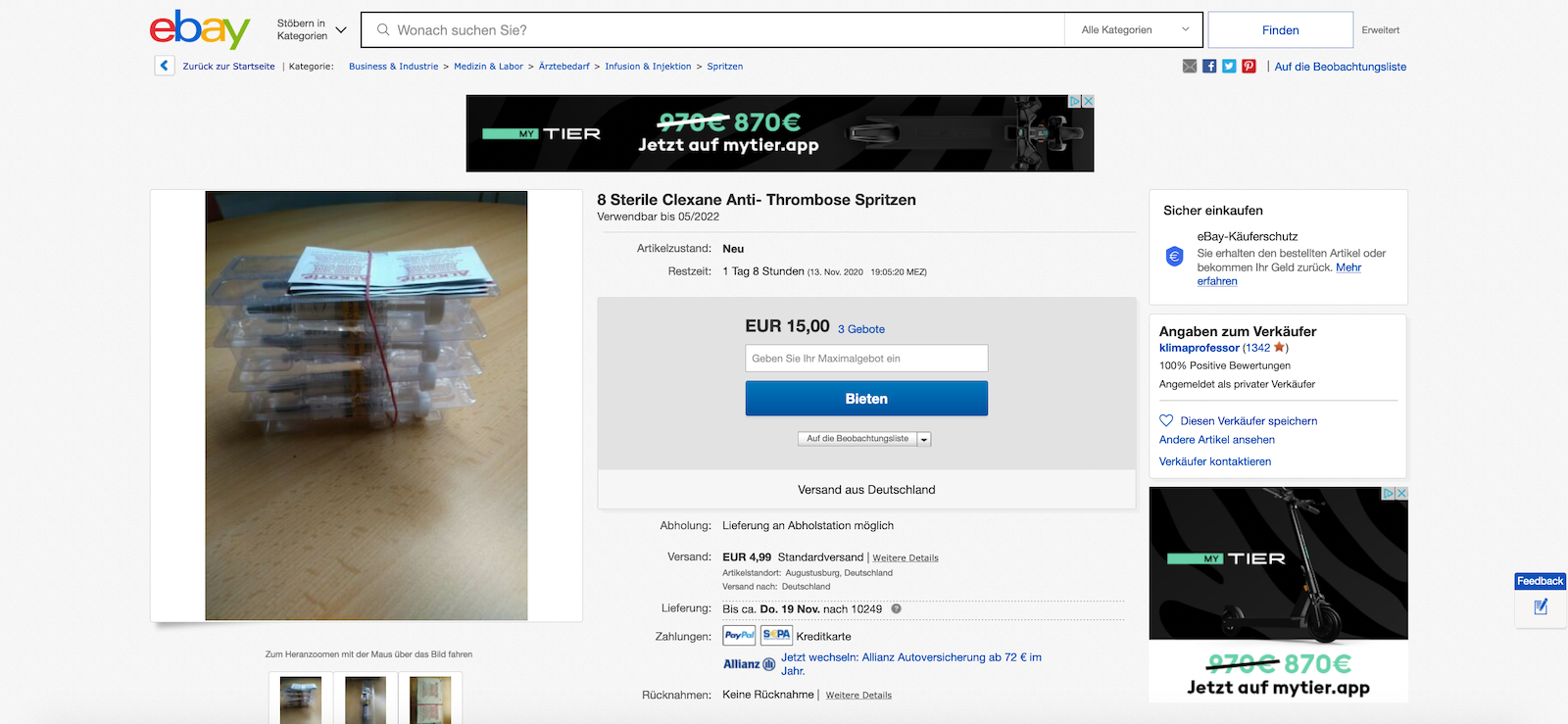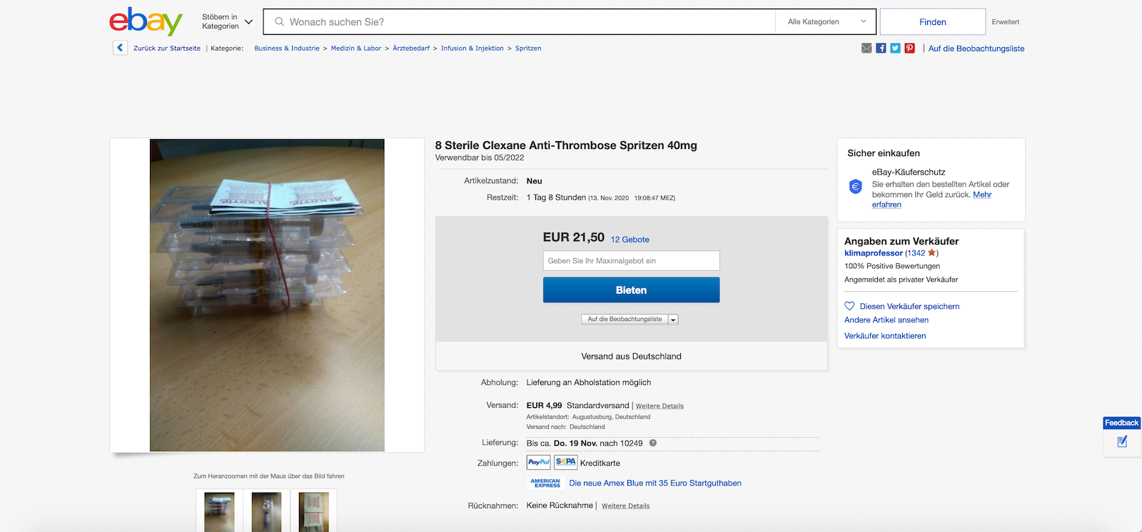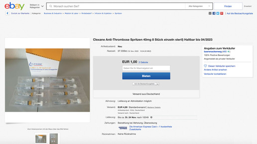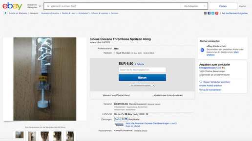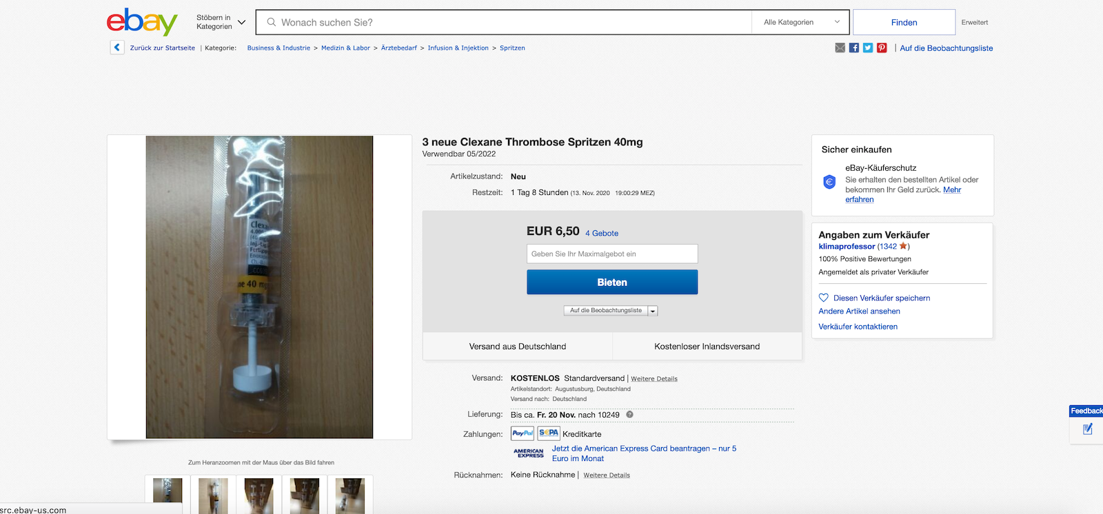 Drei neue Fertigspritzen Clexane 40 mg bietet Nutzer „Klimaprofessor“ zur Auktion an. Verwendbar sind sie laut Angebot bis Mai 2022. Und ob man es glaubt oder nicht: Vier Angebote gibt es bereits, der aktuelle Preis liegt bei 6,50 Euro.