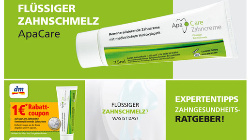 Apacare ist bereits seit mehreren Jahren im Sortiment der Drogeriekette Müller zu finden. Seit etwa acht Monaten ist die Zahnpflege mit dem flüssigen Zahnschmelz auch bei dm gelistet. Eine Gutscheinaktion soll Endverbraucher in die Filialen ziehen und den Verkauf der Produkte mit medizinischem Hydroxylapatit ankurbeln. Im Fokus stehen zwei Produkte. Im Aktionszeitraum vom 16. April bis 30. September erhalten dm-Kunden 1 Euro Rabatt beim Kauf der Apacare Remineralisierenden Zahncreme – solange der Vorrat reicht.