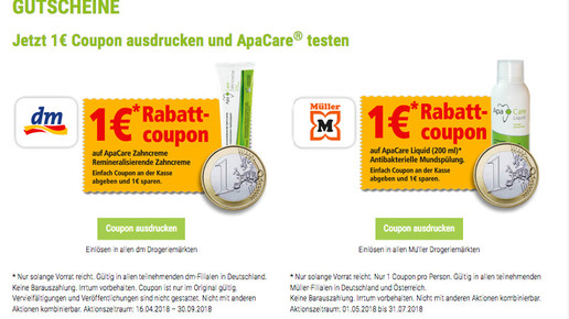 Kunden der Drogeriekette Müller erhalten bei Vorlage des Coupons in den teilnehmenden Filialen in Deutschland und Österreich ebenfalls einen Nachlass von 1 Euro beim Kauf von Apacare Liquid. Die Aktion läuft, solange der Vorrat reicht beziehungsweise vom 1. Mai bis 31. Juli. Apotheken gehen leer aus. Im Moment plane man keine Aktionen, teilt ein Sprecher mit. „Die laufende Rabattaktion ist nur für den Drogeriehandel.“