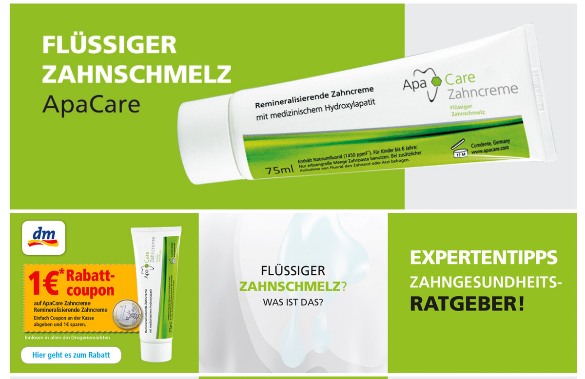 Apacare ist bereits seit mehreren Jahren im Sortiment der Drogeriekette Müller zu finden. Seit etwa acht Monaten ist die Zahnpflege mit dem flüssigen Zahnschmelz auch bei dm gelistet. Eine Gutscheinaktion soll Endverbraucher in die Filialen ziehen und den Verkauf der Produkte mit medizinischem Hydroxylapatit ankurbeln. Im Fokus stehen zwei Produkte. Im Aktionszeitraum vom 16. April bis 30. September erhalten dm-Kunden 1 Euro Rabatt beim Kauf der Apacare Remineralisierenden Zahncreme – solange der Vorrat reicht.
