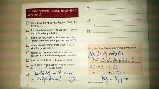 Mehrere Postkarten hatte auch die Greif-Apotheke in Kiel von Kunden erhalten: Eine Kundin bedankte sich etwa für die „Geduld mit mir“ und die Hilfsbereitschaft. Ein anderer Patient verwies auf die „freie Lieferung per Zimmertür im Altenheim“. Eine weitere Patientin freute sich darüber, in der Apotheke immer mit dem Namen persönlich angesprochen zu werden und ihre werde dort „immer geholfen“.